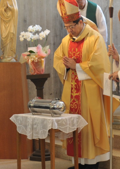 タイムカプセルの祝別 寄贈された聖堂1/50模型