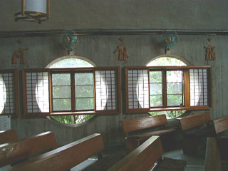 窓は、祭壇の両脇に配された十字架形のステンドグラスの窓、円形に穿たれた壁にはめ込まれた障子付窓など、