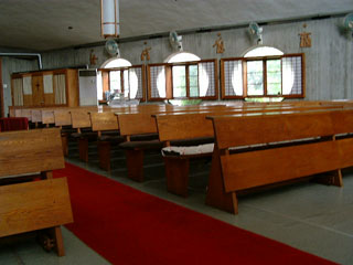 祭壇、説教台、聖水盤、礼拝者の椅子、照明をはじめとする家具もやはりナカシマの作品である。祭壇のデザ